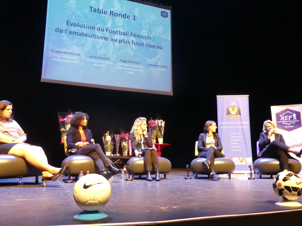 1- L’évolution du football féminin de l’amateurisme au plus haut niveau : Brigitte Henriques (FFF) / Laura Georges (secrétaire FFF) / Peggy Provost (Entraineuse national Pôle France) / Ludivine Floirac (Educatrice amicaliste du Val d’Oise)